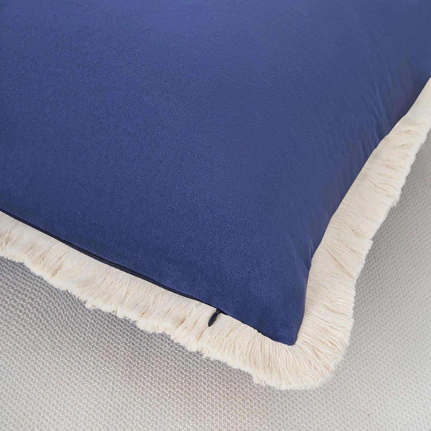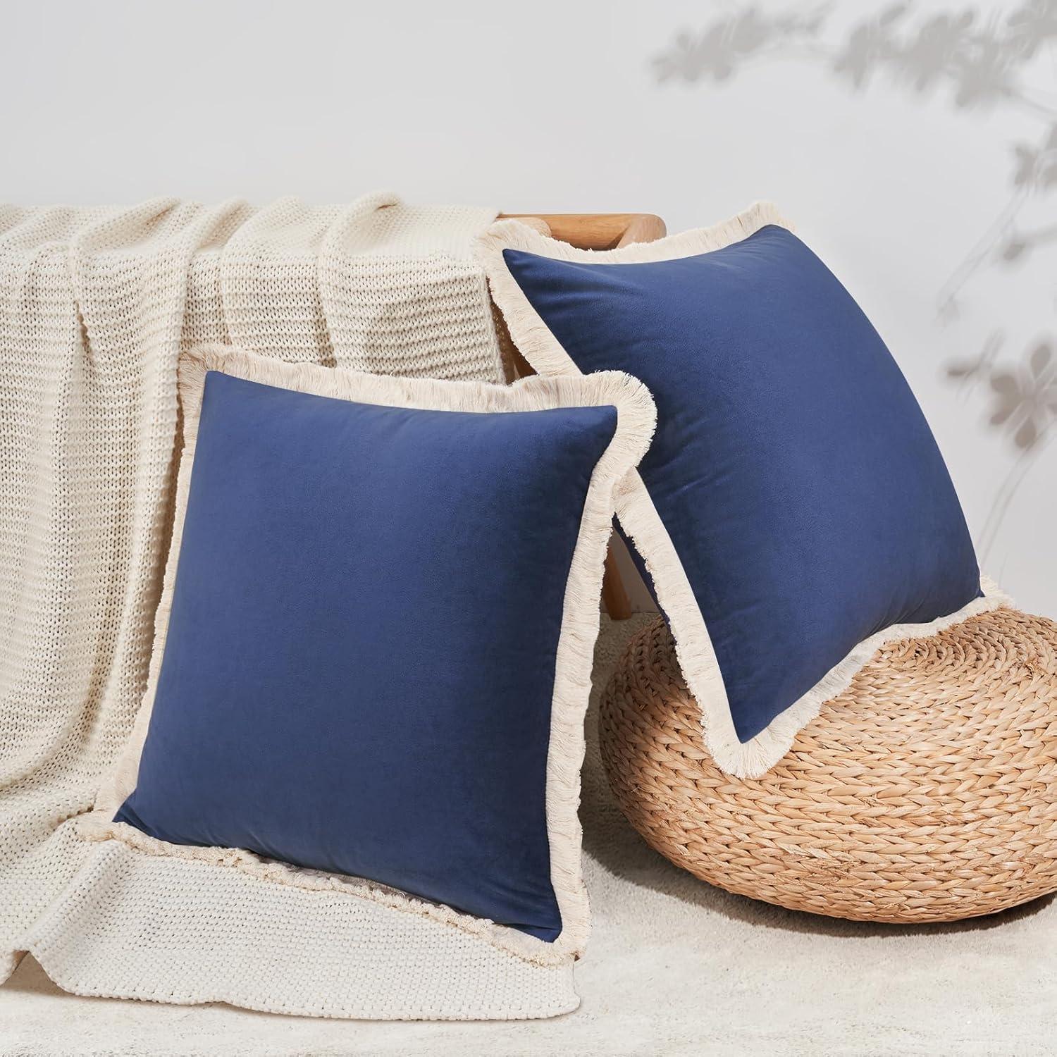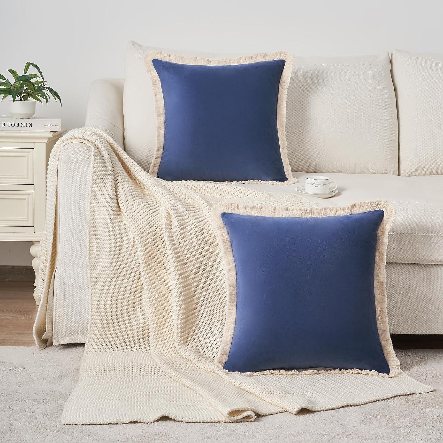MONDAY MOOSE Decorative Throw Pillow Covers Cushion Cases, Set of 2 Soft Velvet Modern Fringe Tassel Designs, Mix and Match for Home Decor, Pillow Inserts Not Included (Beige, 16x16 inch)(Midnight Blue)