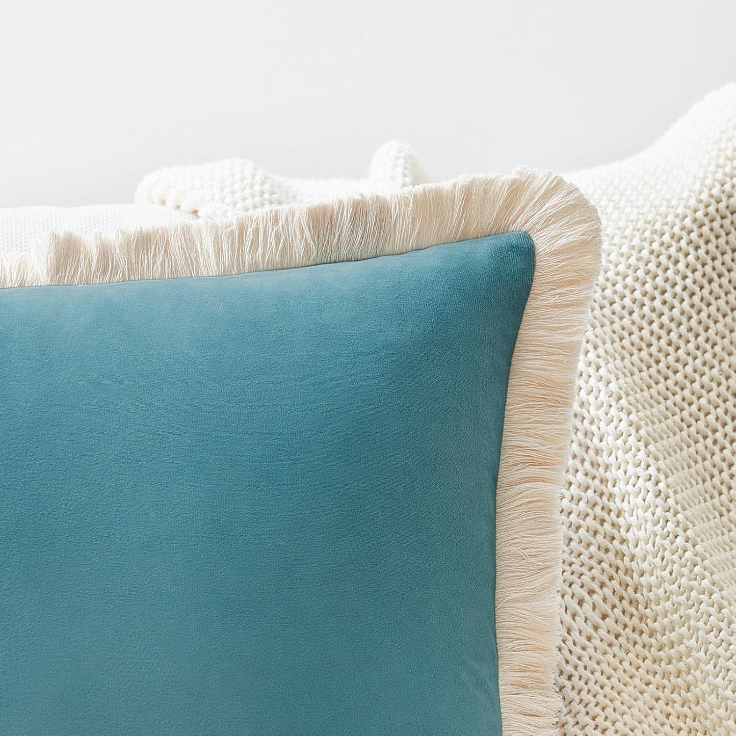 MONDAY MOOSE Decorative Throw Pillow Covers Cushion Cases, Set of 2 Soft Velvet Modern Fringe Tassel Designs, Mix and Match for Home Decor, Pillow Inserts Not Included (Beige, 16x16 inch)(Teal Blue)