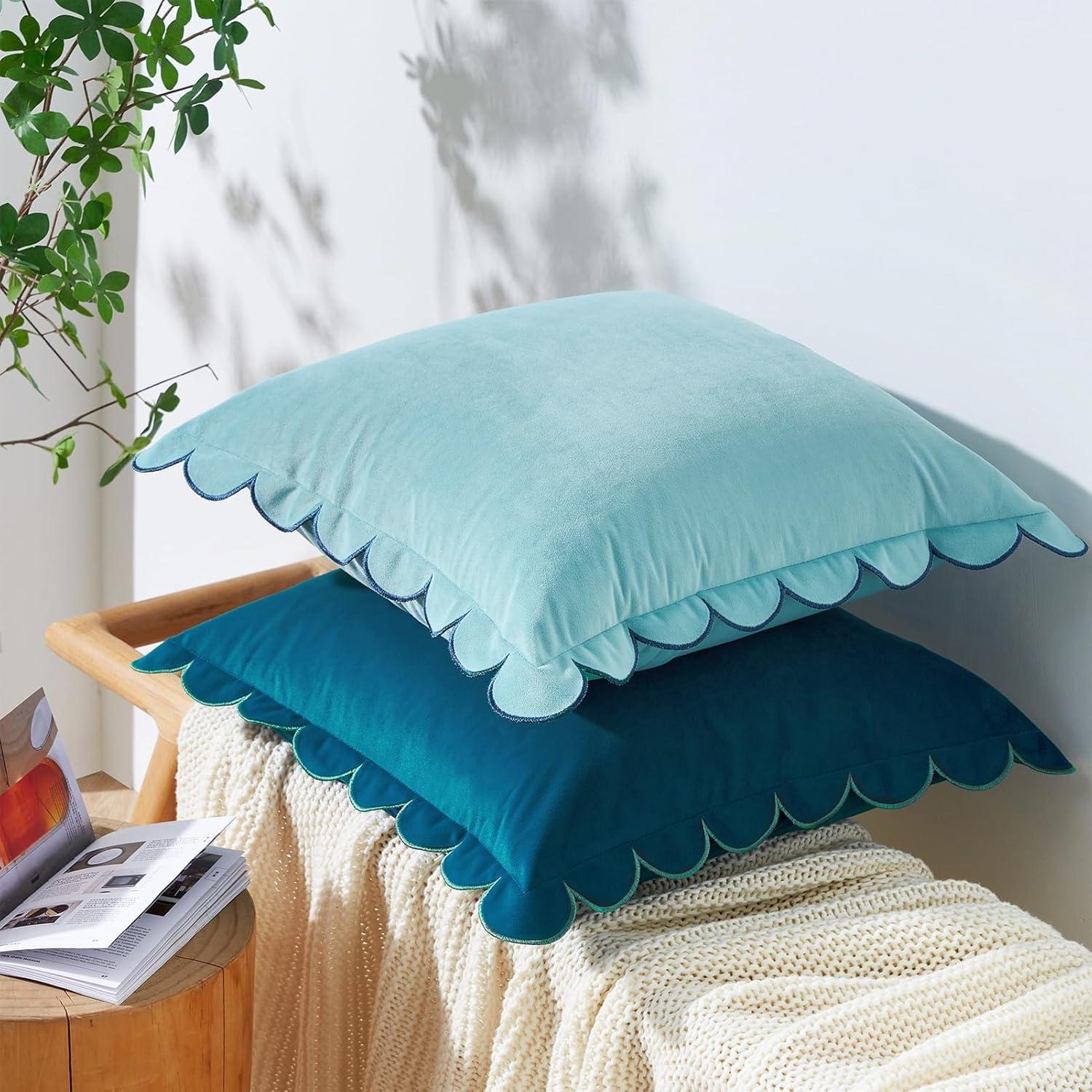 MONDAY MOOSE Decorative Throw Pillow Covers Cushion Cases, Set of 2 Soft Velvet Scalloped Round Edge Designs, Mix and Match for Home Decor, Pillow Inserts Not Included (Light Green, 18x18 inch)(Blue/Light Blue)
