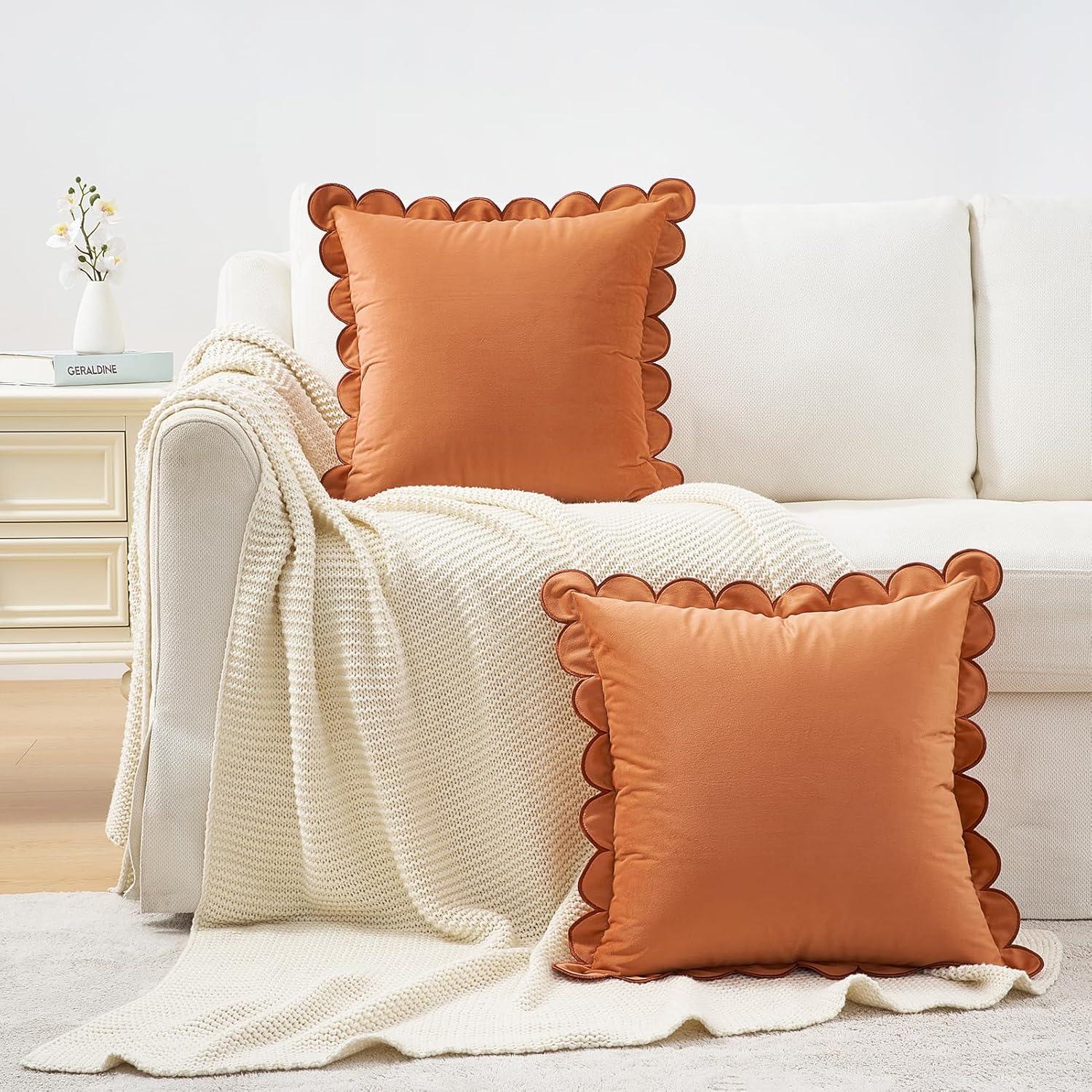 MONDAY MOOSE Decorative Throw Pillow Covers Cushion Cases, Set of 2 Soft Velvet Scalloped Round Edge Designs, Mix and Match for Home Decor, Pillow Inserts Not Included (Light Green, 18x18 inch)(Coral)