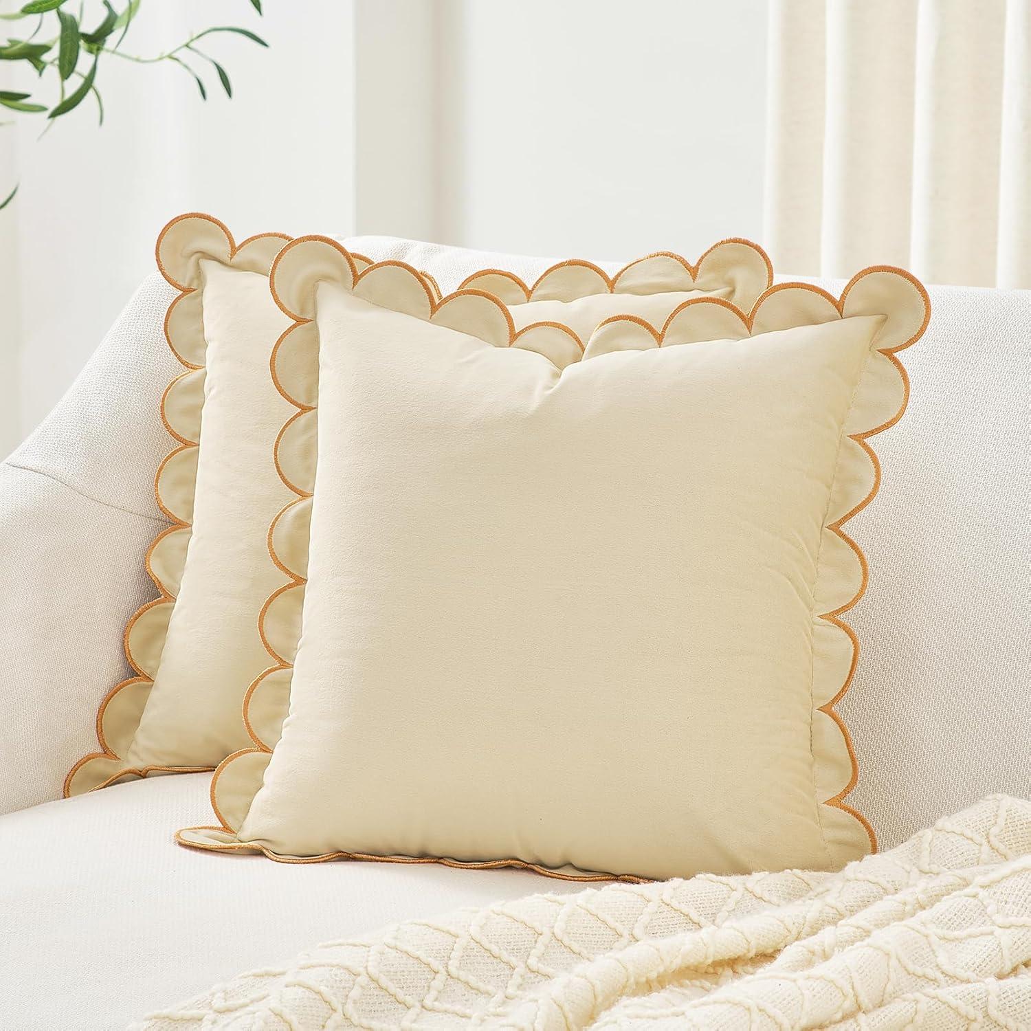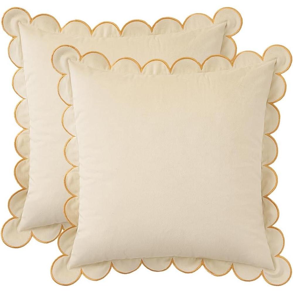 MONDAY MOOSE Decorative Throw Pillow Covers Cushion Cases, Set of 2 Soft Velvet Scalloped Round Edge Designs, Mix and Match for Home Decor, Pillow Inserts Not Included (Light Green, 18x18 inch)(Cream)