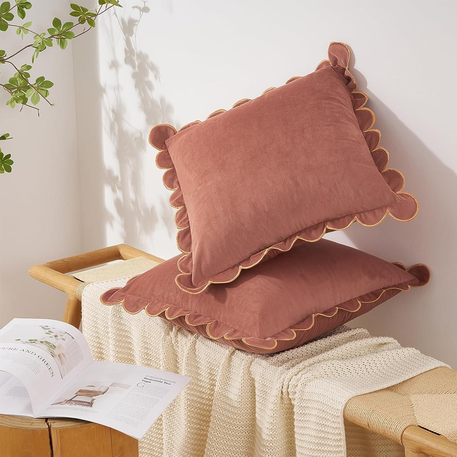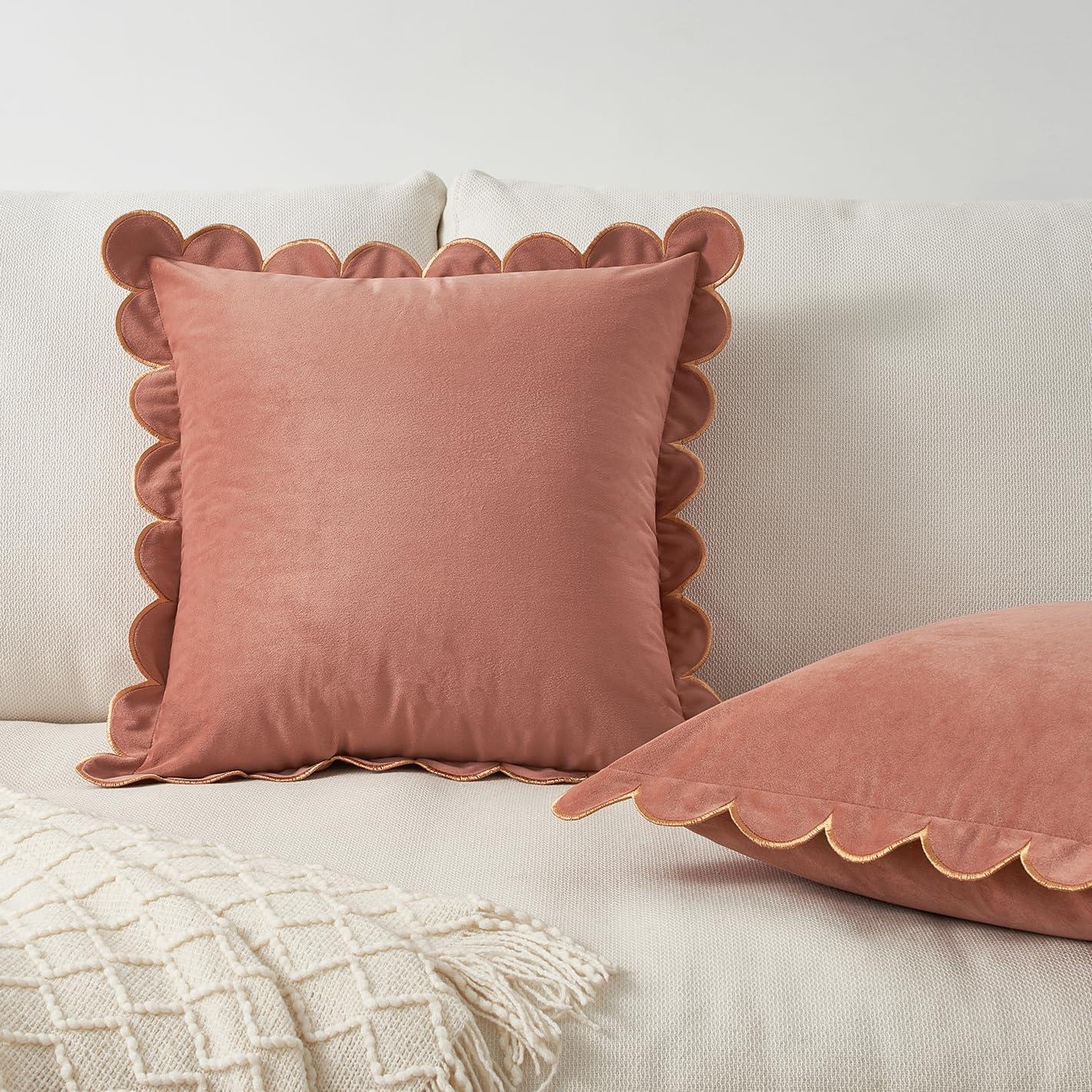 MONDAY MOOSE Decorative Throw Pillow Covers Cushion Cases, Set of 2 Soft Velvet Scalloped Round Edge Designs, Mix and Match for Home Decor, Pillow Inserts Not Included (Light Green, 18x18 inch)(Pink/Honey)