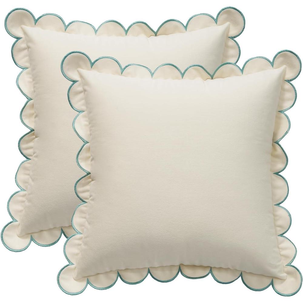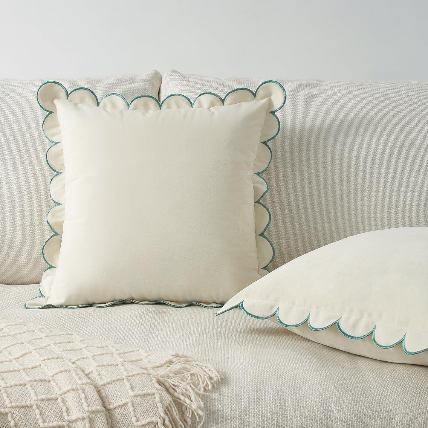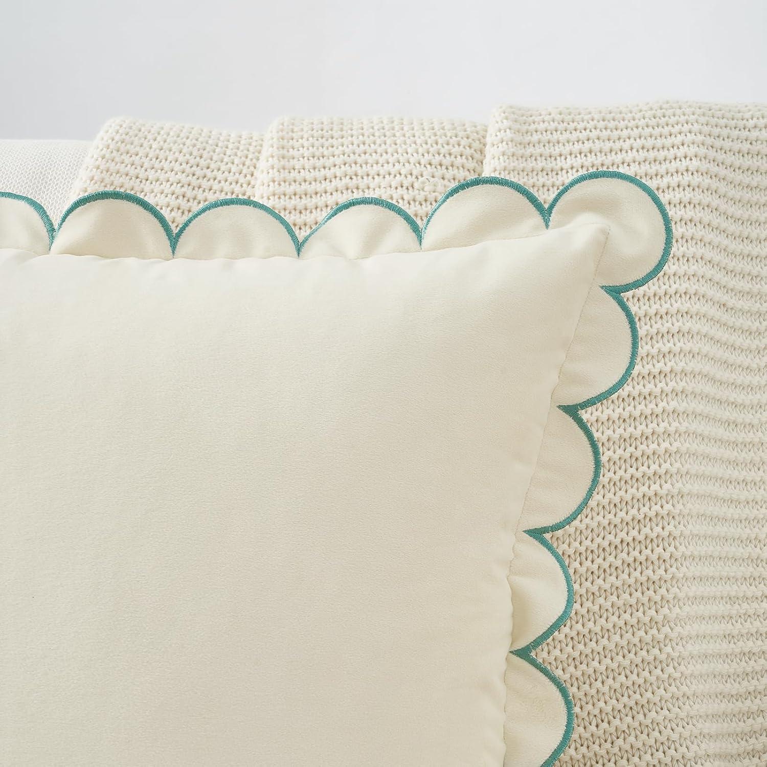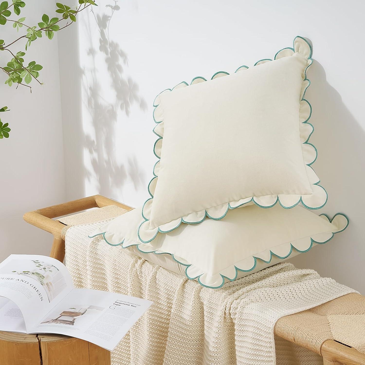 MONDAY MOOSE Decorative Throw Pillow Covers Cushion Cases, Set of 2 Soft Velvet Scalloped Round Edge Designs, Mix and Match for Home Decor, Pillow Inserts Not Included (Light Green, 18×18 inch)(White/Light Blue)