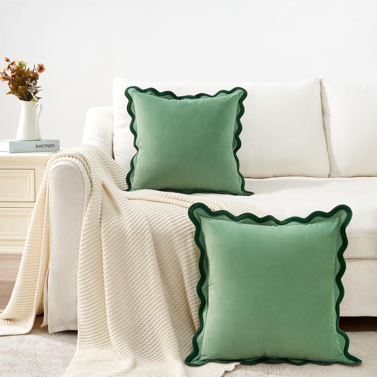 MONDAY MOOSE Decorative Throw Pillow Covers Cushion Cases, Set of 2 Soft Velvet Scalloped Wavy Edge Designs, Mix and Match for Home Decor, Pillow Inserts Not Included (Honey/Pink, 18x18 inch)(Green/Light Green)