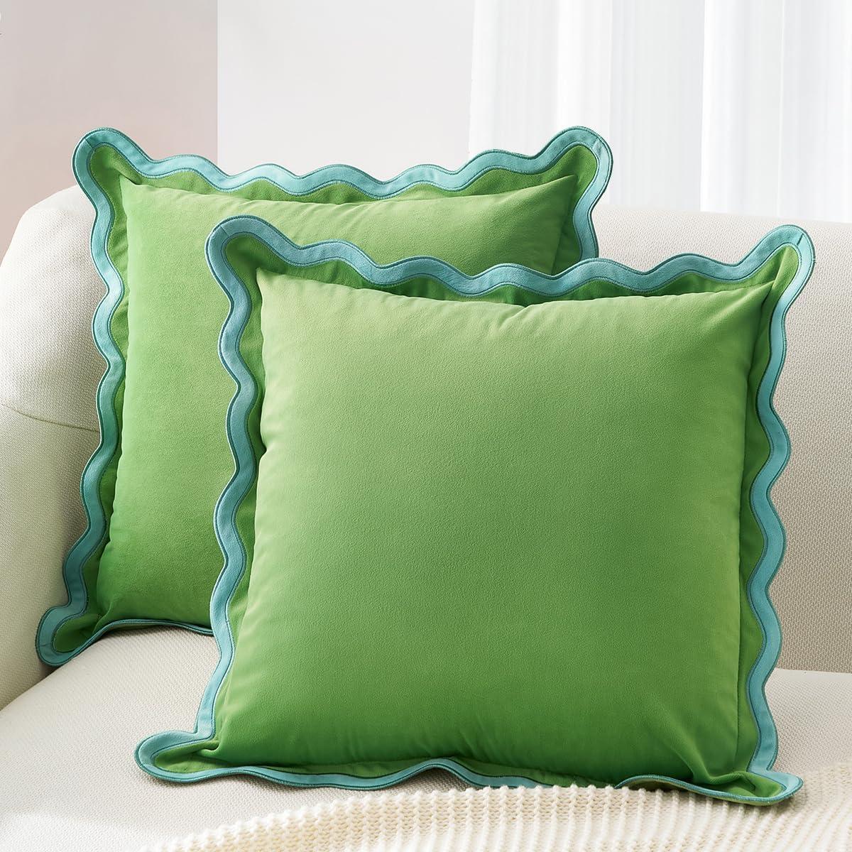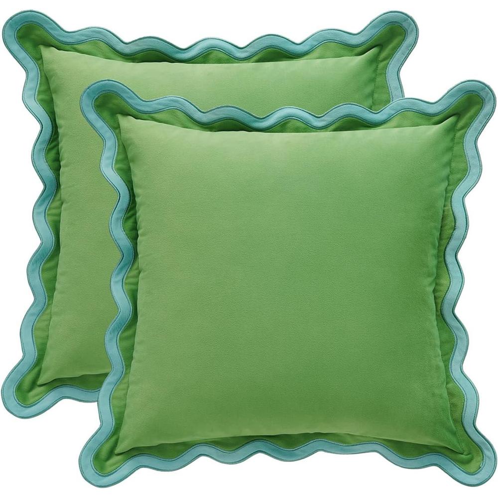 MONDAY MOOSE Decorative Throw Pillow Covers Cushion Cases, Set of 2 Soft Velvet Scalloped Wavy Edge Designs, Mix and Match for Home Decor, Pillow Inserts Not Included (Honey/Pink, 18x18 inch)(Light Blue/Light Green)