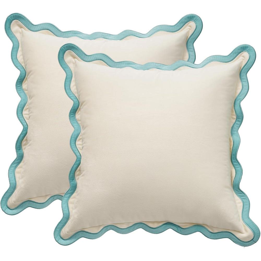 MONDAY MOOSE Decorative Throw Pillow Covers Cushion Cases, Set of 2 Soft Velvet Scalloped Wavy Edge Designs, Mix and Match for Home Decor, Pillow Inserts Not Included (Honey/Pink, 18x18 inch)(White/Light Blue)