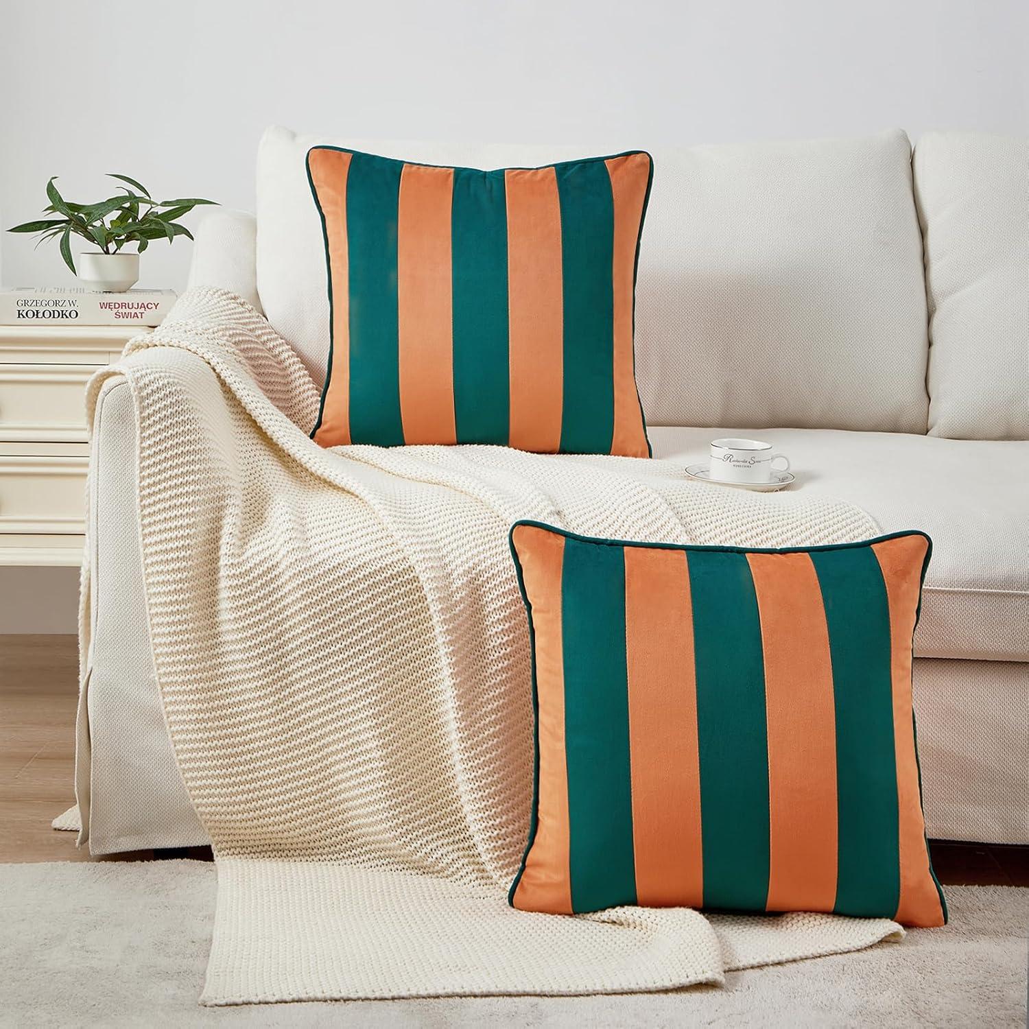 MONDAY MOOSE Decorative Throw Pillow Covers Cushion Cases, Set of 2 Soft Velvet Striped Piping Edge Designs, Pillow Inserts Not Included (Blue/Light Blue, 18×18 inch)(Coral/Dark Teal)