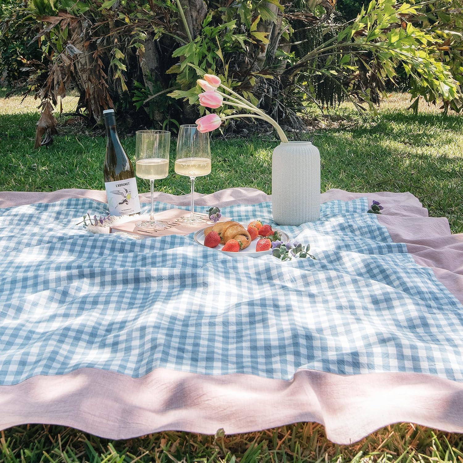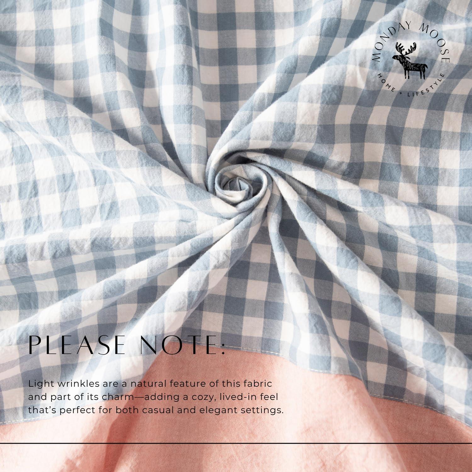 MONDAY MOOSE Gingham Checkered Farmhouse Rustic Ruffle Style Decoration Round Natural Stonewashed Cotton Tablecloth for Kitchen, Dining Room, Restaurant (60″ Round, Beige)(Blue/Clay)