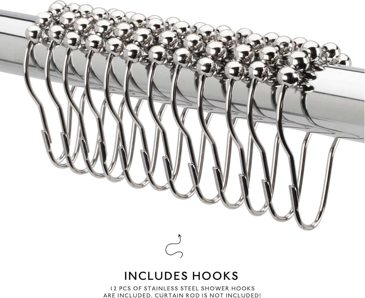 SPECIFICATIONS: Includes (1) premium 100% polyester shower curtain with elegant metal grommet holes + (12) stainless steel hooks. Color may appear more or less saturated depending on drape and light in your space